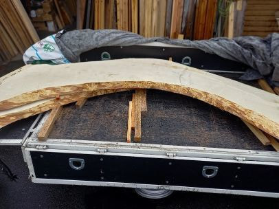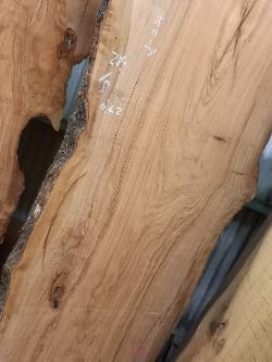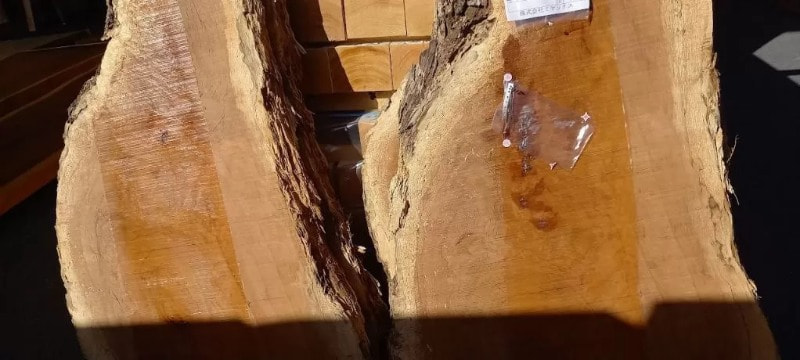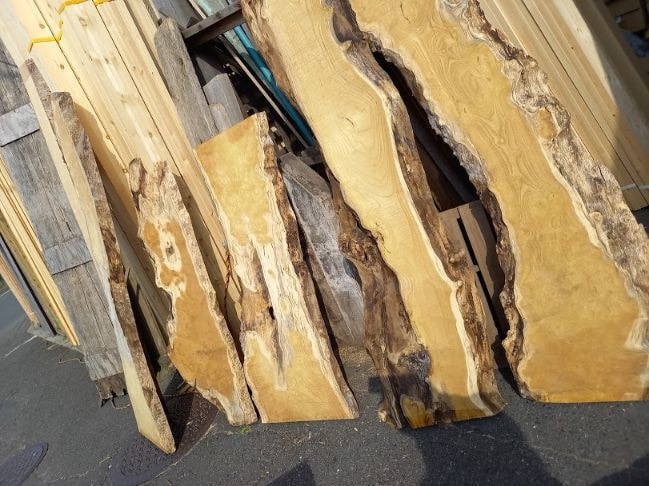 栃の特徴的な曲がり材です。右端以外は栃の特徴であるキラキラとしたチジミ杢を楽しめます。自然の曲がりを活かしたカウンタートップ、天板、ベンチ、看板に使うことで個性的で趣きのある自然木の魅力を何時までも感じることが出来ます。