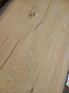 樹齢250~300年のオーク材です。二本の木が合わさって成長したとても希少な材です。割れ、小節はありますが杢目が緻密で雰囲気を味わえる逸品です。3200×700~720×45
