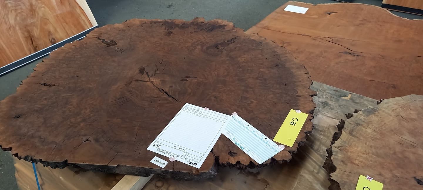 屋久杉の輪切りです。1000年以上のの歴史を刻んで育ってきた材は空洞になってもオーラーを感じます。どのような空間に活かして使うかを想像すると、とてもワクワクしてきます。いずれも直径1200程度です。