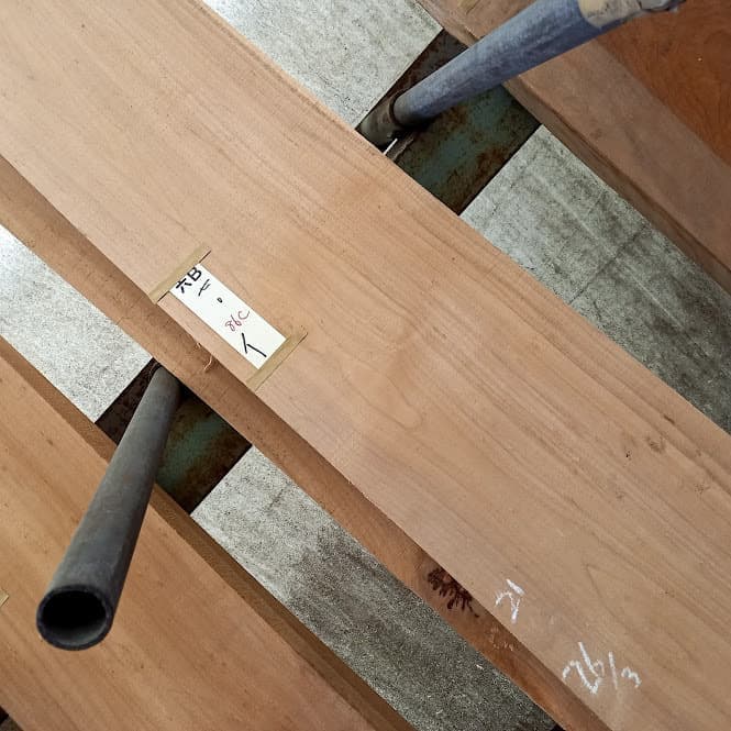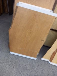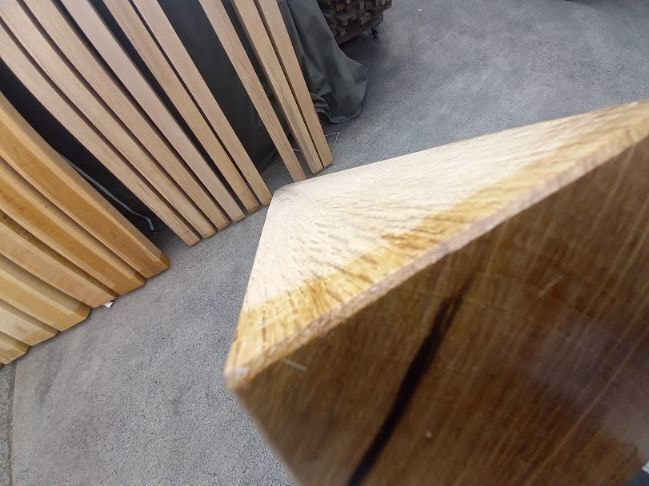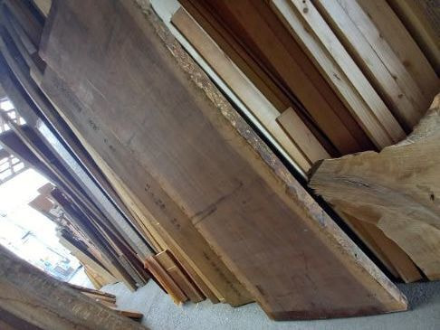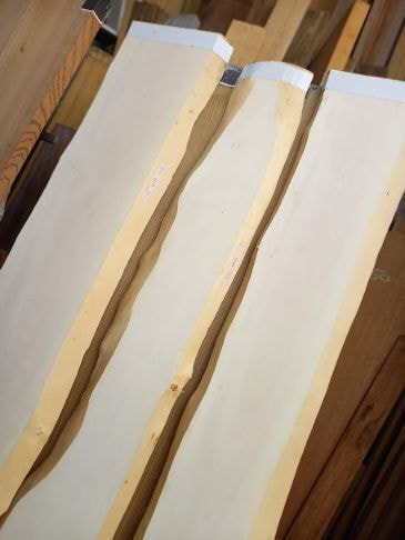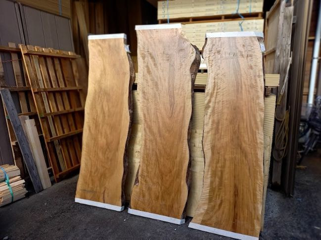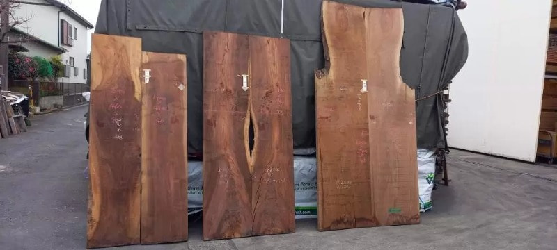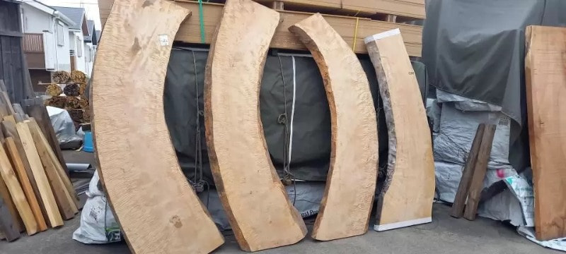 栃の特徴的な曲がり材です。右端以外は栃の特徴であるキラキラとしたチジミ杢を楽しめます。自然の曲がりを活かしたカウンタートップ、天板、ベンチ、看板に使うことで個性的で趣きのある自然木の魅力を何時までも感じることが出来ます。