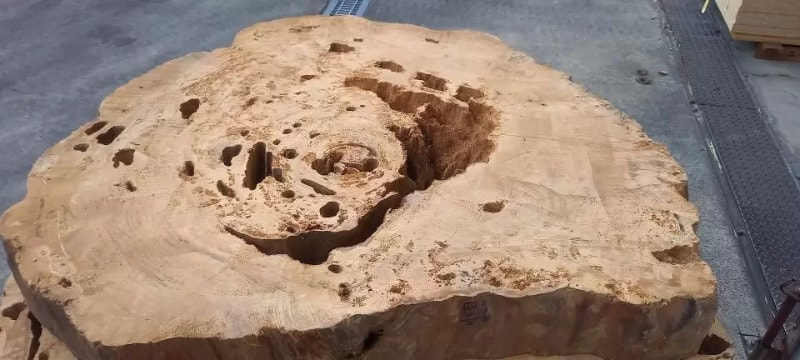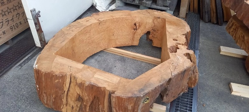 屋久杉の輪切りです。1000年以上のの歴史を刻んで育ってきた材は空洞になってもオーラーを感じます。どのような空間に活かして使うかを想像すると、とてもワクワクしてきます。いずれも直径1200程度です。